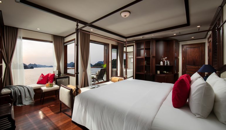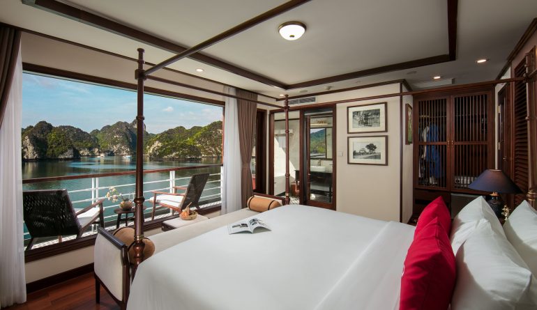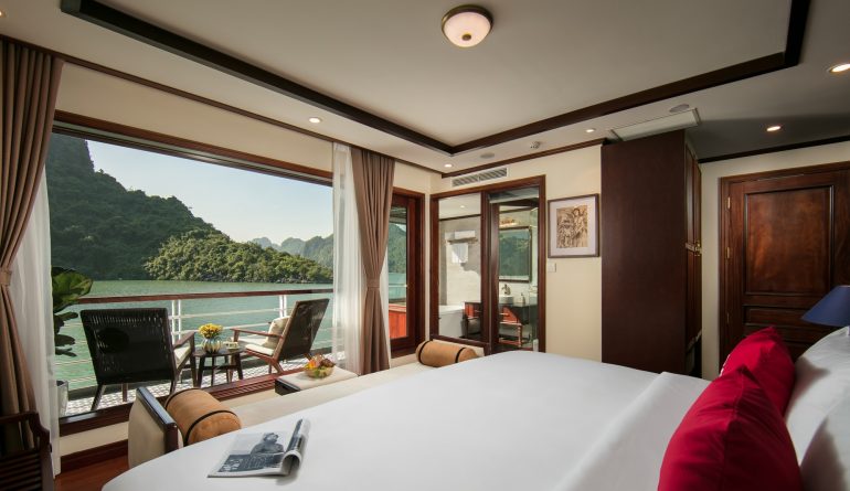 • Phòng nghỉ trên du thuyền sang trọng tiêu chuẩn 5* (có bồn tắm và ban công riêng trong phòng) nhìn ra toàn cảnh Vịnh Lan Hạ.