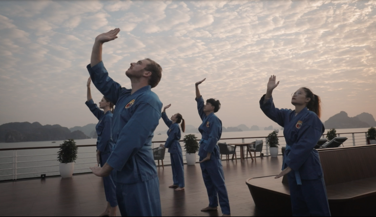 06:00 Cùng ngắm cảnh hoàng hôn trên vịnh và thực hành Vovinam ngay trên Boong tàu.